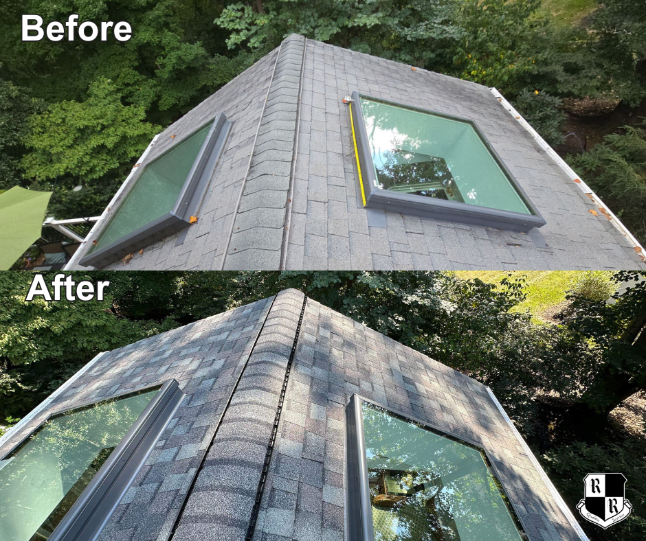 Next, we applied ice and water guard along the eaves, valleys, and around all penetrations. The remaining roof deck received synthetic underlayment for a full moisture barrier. All metal flashing—including the skylight flashing and chimney flashing—was replaced with clean, black metal to match the updated look.