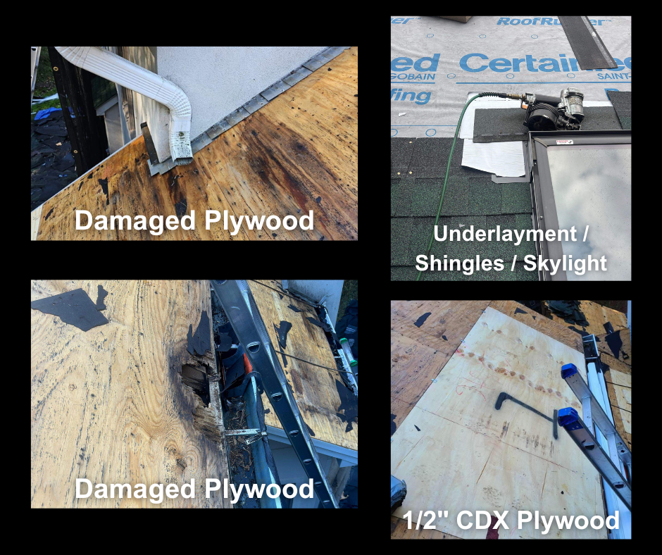 The project began with the complete removal of the existing roofing materials, down to the decking. We identified sections of compromised plywood and replaced them with 1/2″ CDX plywood. We use CDX plywood, not cheaper OSB (Oriented Strand Board), because CDX is specifically designed for structural applications and offers superior water resistance, ensuring a stronger, more reliable foundation for the new roofing system.