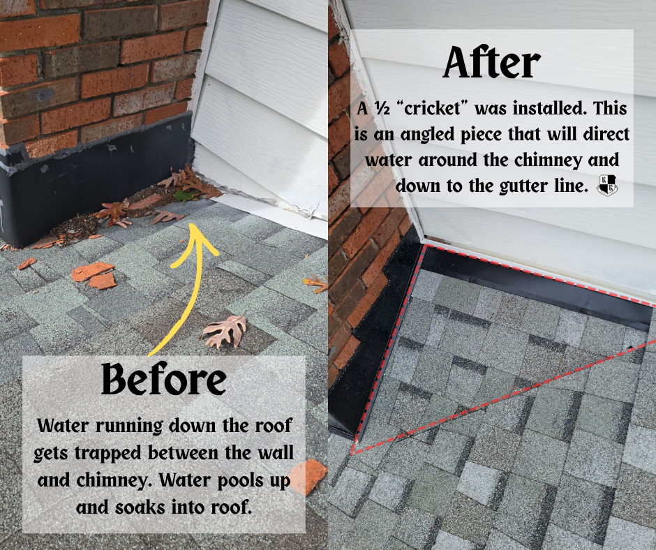 To improve water flow at a critical junction, our team installed a 1/2 cricket at the wall and chimney intersection. This design detail redirects water away from vulnerable areas and reduces long-term wear. We also installed black metal flashing on the chimneys, adding both durability and a clean, modern appearance.